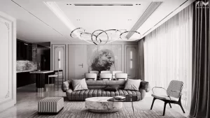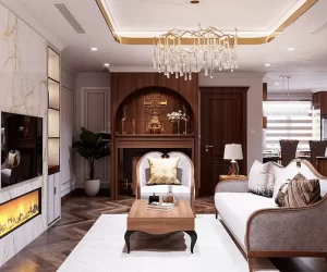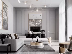Mẫu trang trí phòng khách nhà cấp 4 phong cách tân cổ điển với gam màu trung tính