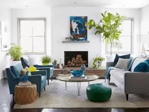 Mẫu thiết kế phòng khách nhà cấp 4 tươi sáng với màu trắng kết hợp màu xanh