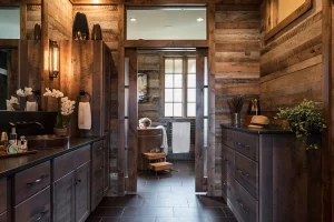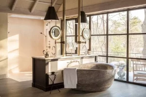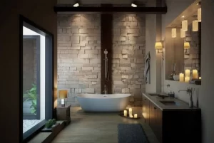 Đặc trưng của phong cách Rustic hướng đến sự mộc mạc, giản dị từ những chất liệu gần gũi với tự nhiên nhưng đặt trong một kiểu mẫu hiện đại. Những phòng tắm có phong cách Rustic rất phù hợp với những người có tâm hồn nghệ sĩ bởi không gian sống mà còn phong cách Rustic mang lại sẽ tạo cảm giác ấm cúng, dễ chịu.
